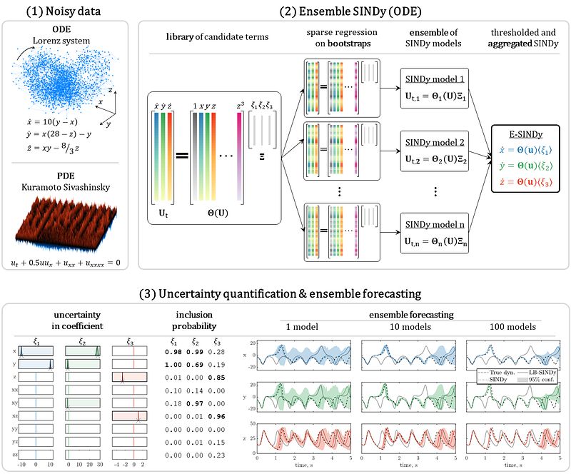 Figure: Schematic of the E-SINDy framework.  E-SINDy exploits the statistical method of bootstrap aggregating (bagging) to identify ordinary and partial differential equations that govern the dynamics of observed noisy data. First, sparse regression is performed on bootstraps of the measured data to identify an ensemble of SINDy models.  Mean or median of the coefficients are then computed, coefficients with low inclusion probabilities are thresholded, and the E-SINDy model is aggregated and used for probabilistic forecasting, active learning, or control.